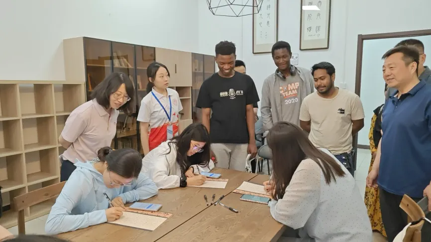 活动现场,中外学子以书法为纽带,展开跨文化对话。留学生们好奇地执起毛笔执笔临帖,在横竖撇捺间感受汉字的风骨;中国学生则用英语娓娓道来,讲述传统艺术背后承载的东方智慧——文化交融的种子在此生根发芽。