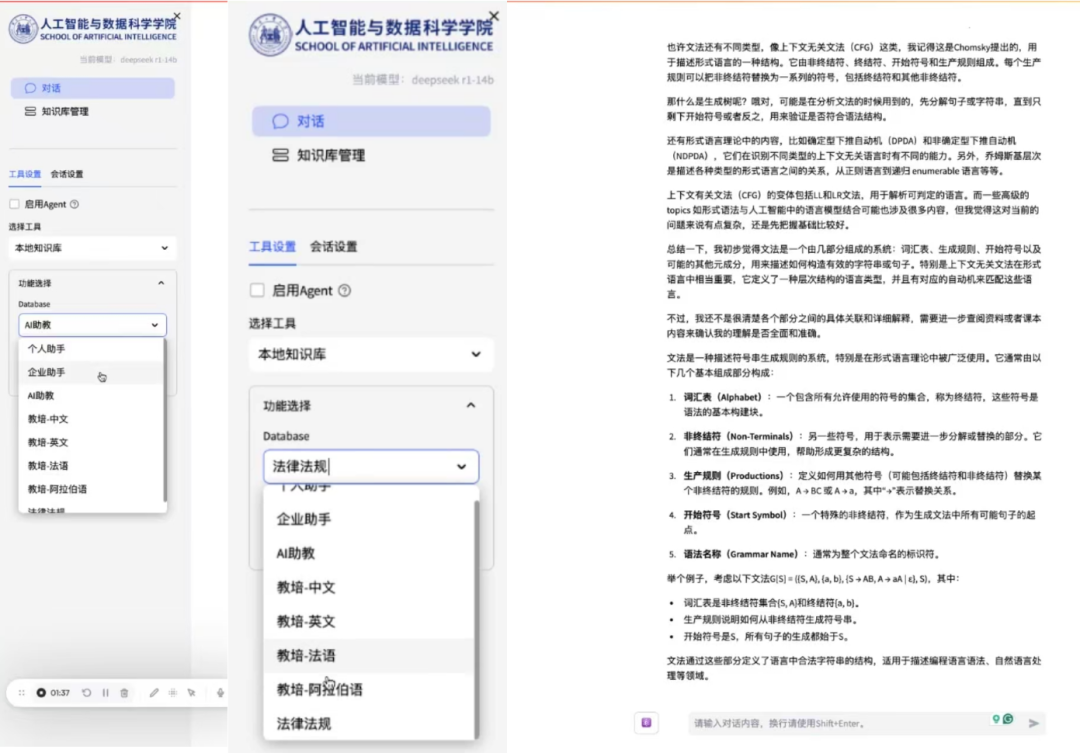 AI助力智能个人助理,提升学习与工作效率:学院针对教师和学生的需求,基于DeepSeek系列模型开发了智能个人助理系统。该系统通过构建专属的课程知识库,教师服务端为教师提供个性化教学支持,学生服务端为学生提供定制化学习资源。AI助理能够智能推荐学习内容、分析学习进度、解答学术问题,极大提高了教学和学习效率。借助AI技术的辅助,教师能够更好地掌控课堂节奏,学生也能享受更加高效和个性化的学习体验,进一步推动教育质量的提升。