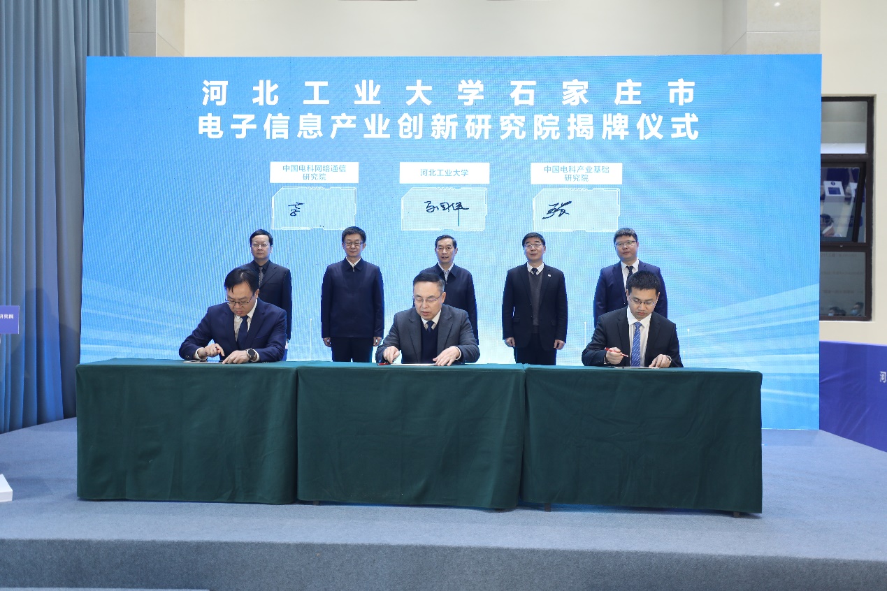 省发展和改革委副主任、省能源局局长姚运涛,省科技厅副厅长高建锋,省工信厅副厅长王建峰,省科协副主席刘伯颖,市委常委、组织部部长罗利,市委常委、秘书长李瑞峰以及省直、市直方面的有关同志,中国电科网络通信研究院党委书记徐小刚,中国电科产业基础研究院常务副院长崔玉兴,中国电科网络通信研究院副院长李立峰,中国电科产业基础研究院副院长张力江以及有关部门负责同志,学校相关职能部门和学院负责同志以及河北晶禾电子技术股份有限公司、石家庄数英仪器有限公司等13家企业代表出席揭牌仪式。