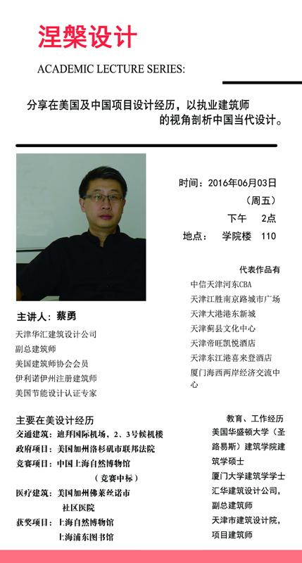 主讲人:蔡勇,天津华汇建筑设计公司副总建筑师,美国建筑师协会会员,伊利诺伊州注册建筑师,美国节能设计认证专家。
